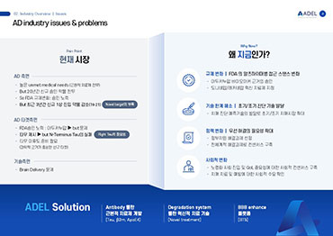 아델은 알츠하이머병을 비롯한 퇴행성 뇌질환의 치료제와 진단법을 개발하는 바이오텍 기업입니다.